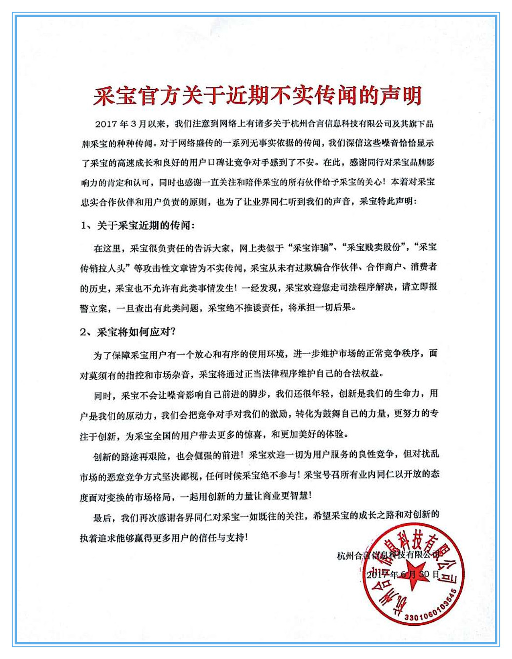 2017年3月以來,我們注意到網絡上有諸多關于杭州合言信息科技有限公司及其旗下品牌采寶的種種傳聞。對于網絡盛傳的一系列無事實依據的傳聞,我們深信這些噪音恰恰顯示了采寶的高速成長和良好的用戶口碑讓競爭對手感到了不安。在此,感謝同行對采寶品牌影響力的肯定和認可,同時也感謝一直關注和陪伴采寶的所有伙伴給予采寶的關心!本著對采寶忠實合作伙伴和用戶負責的原則,也為了讓業界同仁聽到我們的聲音,采寶特此聲明: