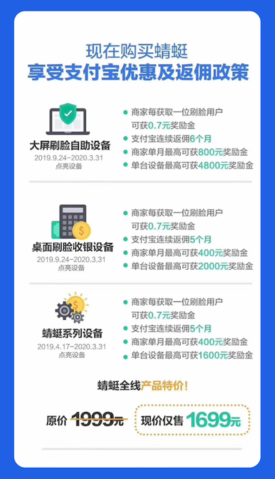 同時提高了激勵政策:對于“蜻蜓”、桌面刷臉收銀設備、大屏刷臉自助設備,單個設備最高可以獲得1600元、2000元、4800元的獎勵。(具體政策見下圖)