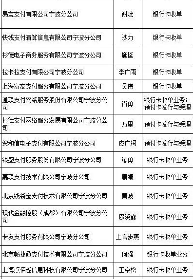 易寶支付有限公司寧波分公司、快錢支付清算信息有限公司寧波分公司、杉德電子商務(wù)服務(wù)有限公司寧波分公司、拉卡拉支付有限公司寧波分公司、上海富友支付服務(wù)有限公司寧波分公司、通聯(lián)支付網(wǎng)絡(luò)服務(wù)股份有限公司寧波分公司、杉德支付網(wǎng)絡(luò)服務(wù)發(fā)展有限公司寧波分公司、資和信電子支付有限公司寧波分公司、銀盛支付服務(wù)股份有限公司寧波分公司、嘉聯(lián)支付技術(shù)有限公司寧波分公司、北京錢袋寶支付技術(shù)有限公司寧波分公司、現(xiàn)代金融控股(成都)有限公司寧波分公司、卡友支付服務(wù)有限公司寧波分公司 、北京暢捷通支付技術(shù)有限公司寧波分公司、上海點佰趣信息科技有限公司寧波分公司、中銀通支付商務(wù)有限公司寧波分公司。