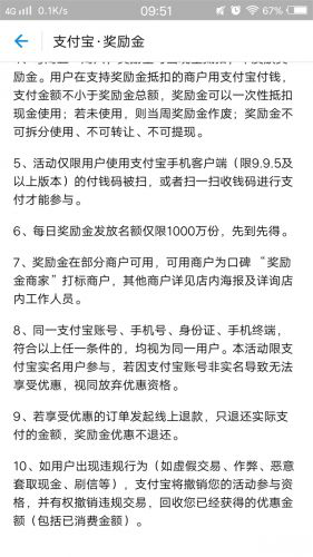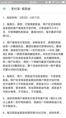 現(xiàn)在,支付寶推出了一項(xiàng)類似的服務(wù):獎(jiǎng)勵(lì)金。周日-周四訂單金額不小于2元立得獎(jiǎng)勵(lì)金,周五-周六當(dāng)現(xiàn)金抵扣。